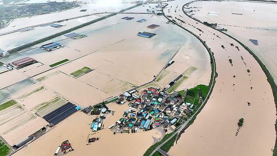 충남 지역 일대에 16~17일 이틀간 500㎜가 넘는 폭우가 쏟아진 가운데 17일 충남 예산군 삽교읍 용동3리 일대 마을이 흙탕물에 잠겨 있다. 연합뉴스 |