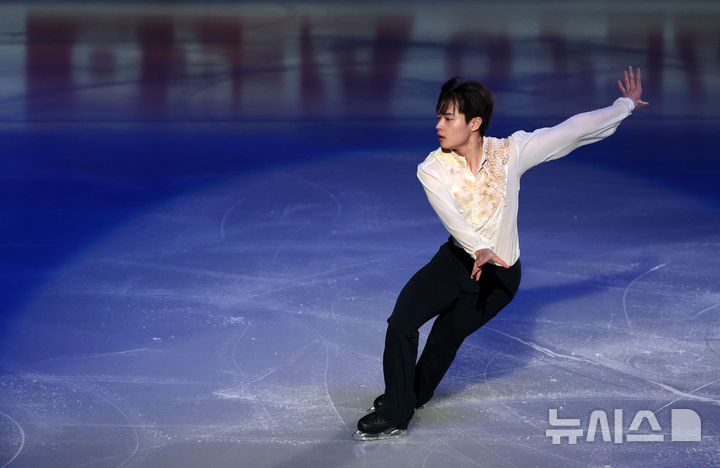 [서울=뉴시스] 고범준 기자 = 남자 싱글 김현겸이 23일 오후 서울 양천구 목동 아이스링크에서 열린 2025 ISU 4대륙 피겨 선수권대회 갈라쇼에서 화려한 무대를 선보이고 있다. 2025.02.23. bjko@newsis.com |