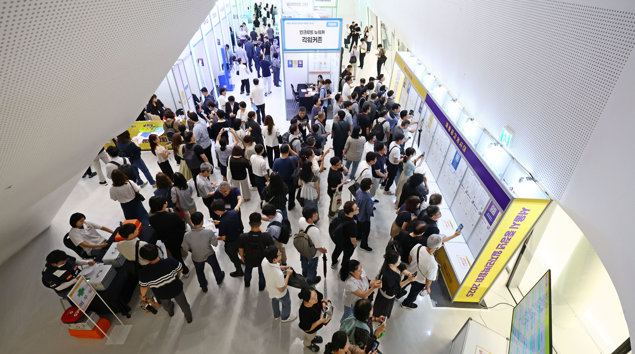 지난 1일 서울 중구 동대문디자인플라자(DDP) 아트홀에서 열린 ‘서울시 중장년 일자리박람회 2025’에서 구직자들이 채용공고 게시대를 살펴보고 있다. [연합] |