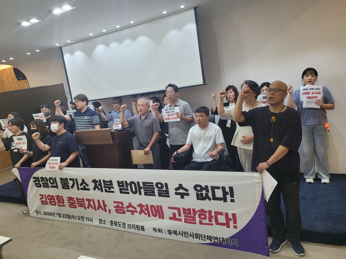 충북시민사회단체연대회의는 23일 도청 기자회견에서 “경찰의 무혐의 처분을 받아들일 수 없다”며 “김영환 충북지사를 공수처에 고발한다”고 주장했다.