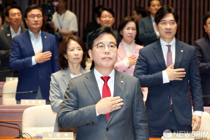 [서울=뉴스핌] 정일구 기자 = 송언석 국민의힘 비상대책위원장 겸 원내대표가 23일 오전 서울 여의도 국회에서 열린 의원총회에서 국민의례를 하고 있다. 2025.07.23 mironj19@newspim.com |