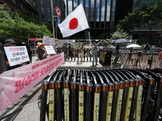 소녀상 건너편에서는 일부 수요시위 참가자가 "친일파, 매국노" 등을 외치며 항의했다. 경찰이 양측을 바리케이드로 분리하면서 물리적 충돌은 없는 것으로 확인됐다.