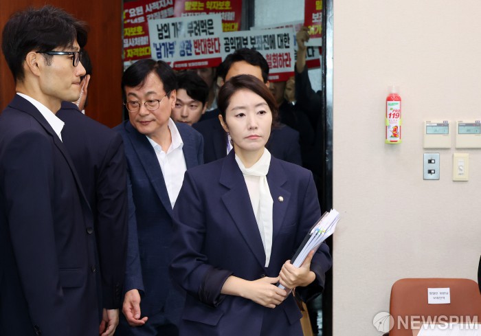 [서울=뉴스핌] 정일구 기자 = 강선우 여성가족부 장관 후보자가 14일 오전 서울 여의도 국회 여성가족위원회에서 열린 인사청문회에 국민의힘 보좌진협의회 항의를 받으며 참석하고 있다. 2025.07.14 mironj19@newspim.com |