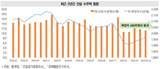 통상 여름철에 건설 일자리 수가 소폭 증가하는 경향이 있으나, 최근 건설수주 동향을 고려하면 올해 200만명을 다시 넘기는 어려울 것이란 예상이 나온다.