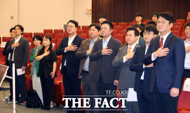 천하람 개혁신당 대표 직무대행 겸 원내대표와 최고위원 후보자 등 참석자들이 23일 서울 여의도 국회도서관에서 열린 제2차 전당대회에서 국민의례를 하고 있다. /뉴시스 |