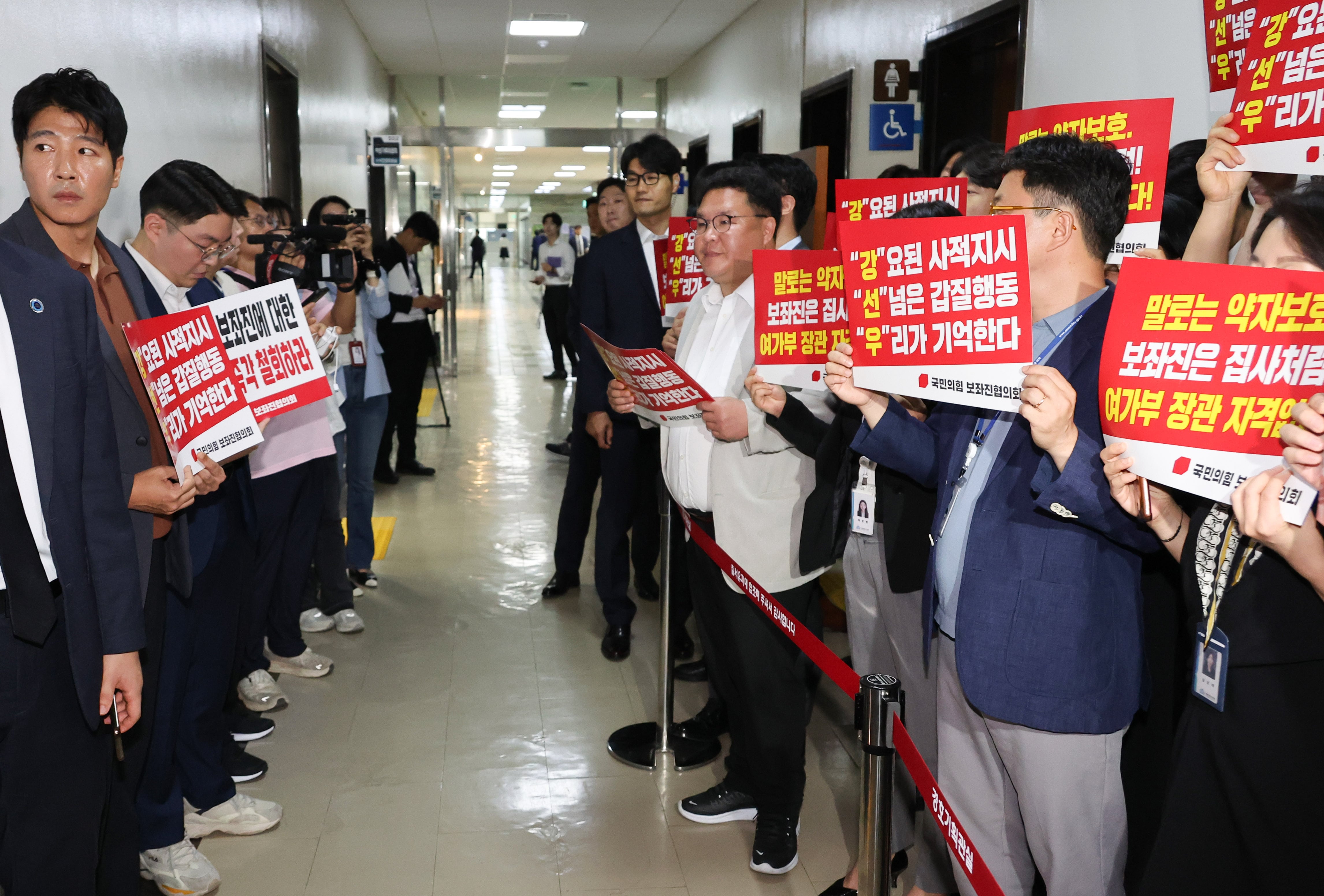 국민의힘 보좌진이 강선우 여성가족부 장관 후보자 인사청문회가 열린 지난 14일 국회 본청에서 강 후보자의 사퇴를 촉구하는 피켓시위를 하고 있다. 강 후보자는 ‘보좌진 갑질’ 논란이 커지자 청문회 이후 9일 만인 23일 자진사퇴했다./연합뉴스 |