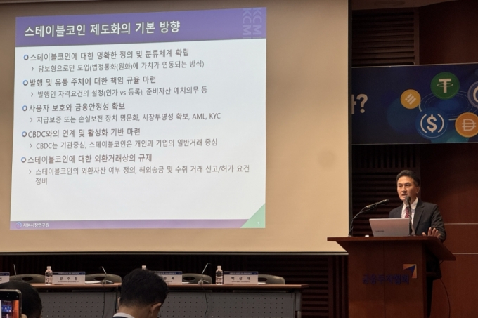 아울러 "스테이블코인은 국경간거래에 사용될 가능성이 높기 때문에 외국환거래법으로 어떻게 자금의 흐름을 통제하고, 자금세탁 방지기능을 어떤 방식으로 적용할지 고민하는 것도 필요하다"며 "해외 송금·수취 거래신고 제도 정비를 병행할 필요가 있다"고 했다.