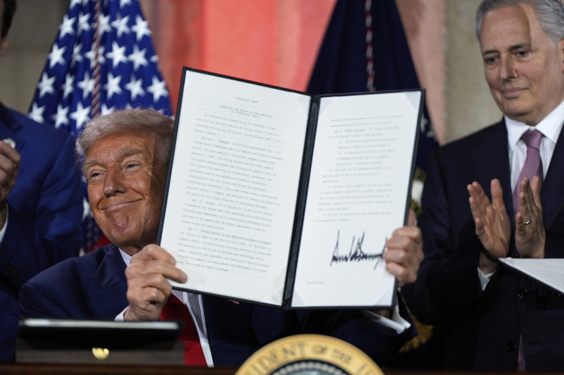도널드 트럼프 미국 대통령이 23일(현지시간) 워싱턴 DC에서 열린 인공지능(AI) 서밋 행사 도중 서명한 행정명령을 들어 관중들에게 보이고 있다. AP연합뉴스 |