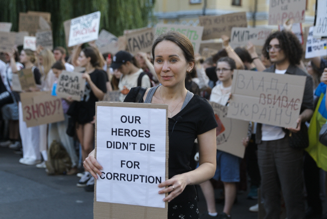 우크라이나 키이우에서 23일(현지시간) 시민들이 젤렌스키 대통령의 법안에 반대하는 시위를 벌였다./EPA 연합 |