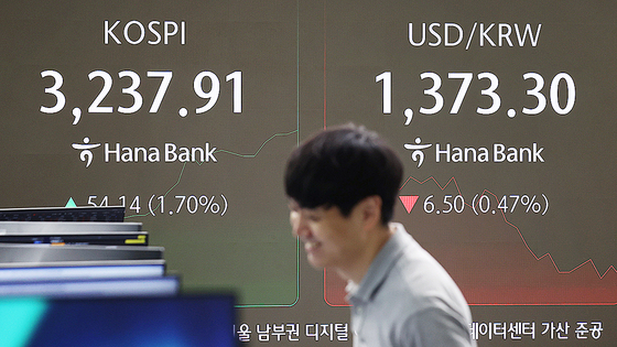 7월 24일 오전 서울 중구 하나은행 본점 딜링룸 모습. 이날 코스피는 전장보다 24.29포인트(0.81%) 오른 3209.43으로, 원달러 환율은 6.1원 내린 1,373.7원으로 시작했다. 연합뉴스 |