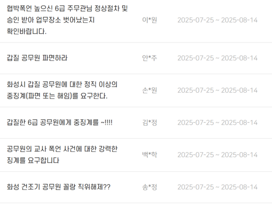 초등학생 자녀의 담임 교사를 찾아가 "나도 공무원이라 어떻게 괴롭히면 말려 죽이는지 안다" 등의 폭언을 한 화성시청 소속 6급 공무원에 대한 파면 요청이 화성시 민원게시판을 가득 채우고 있다.