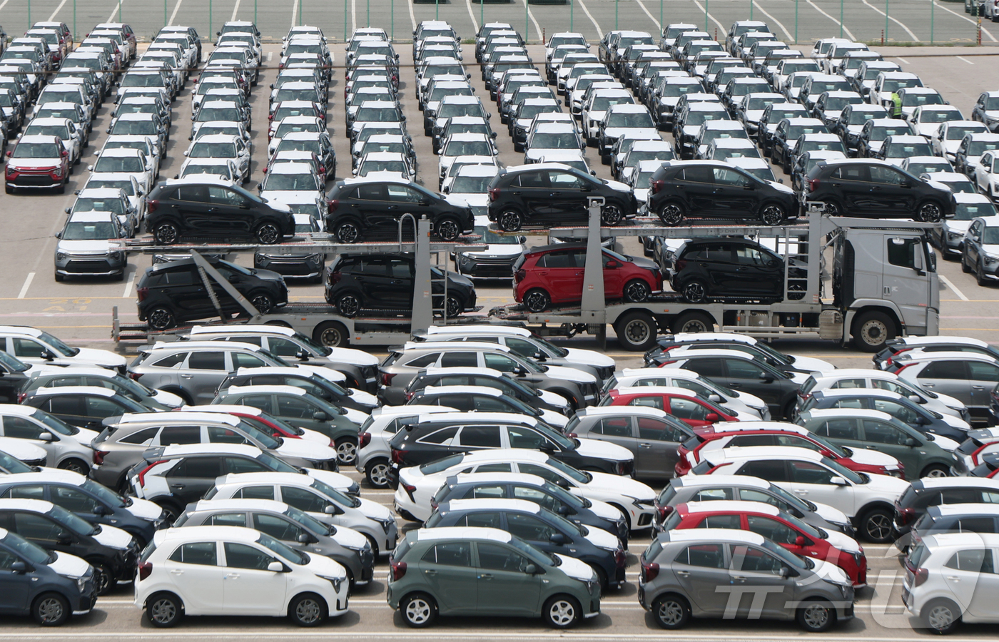 (평택=뉴스1) 김영운 기자 = 한국이 미국의 자동차 관세를 낮추기 위해 대미 투자펀드 조성을 검토 중이라고 블룸버그통신이 24일 보도했다. 익명을 요구한 소식통은 하워드 러트닉 미국 상무장관이 대미 투자 규모로 한국에 4000억 달러(약 550조 원)라는 수치를 제시했다고 전했다. 사진은 이날 경기 평택시 포승읍 평택항에 수출용 차량들이 세워져 있는 모습. 2025.7.24/뉴스1