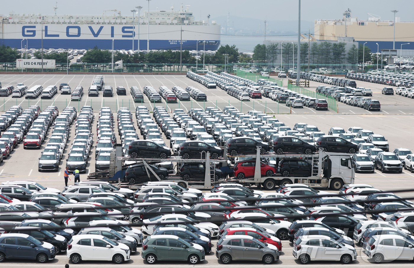 (평택=뉴스1) 김영운 기자 = 한국이 미국의 자동차 관세를 낮추기 위해 대미 투자펀드 조성을 검토 중이라고 블룸버그통신이 24일 보도했다. 익명을 요구한 소식통은 하워드 러트닉 미국 상무장관이 대미 투자 규모로 한국에 4000억 달러(약 550조 원)라는 수치를 제시했다고 전했다. 사진은 이날 경기 평택시 포승읍 평택항에 수출용 차량들이 세워져 있는 모습. 2025.7.24/뉴스1