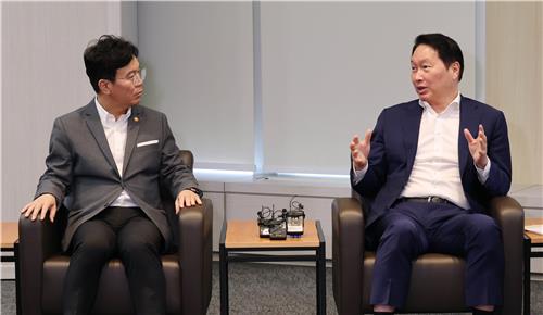 (서울=연합뉴스) 조성흠 기자 = 최태원 대한상공회의소 회장은 24일 서울 중구 대한상의 회관에서 김영훈 고용노동부 장관과 만나 노동시장 현안에 대해 논의했다.