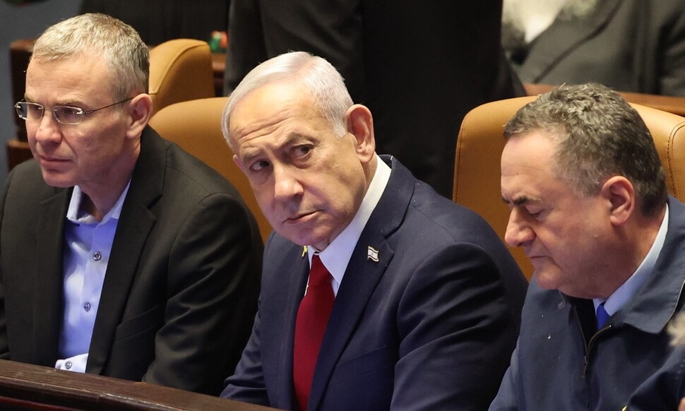 베냐민 네타냐후 이스라엘 총리(가운데)가 23일(현지시각) 예루살렘에 있는 의회에서 서안지구 합병을 승인하는 법안에 투표하는 본회의에 참석했다. 예루살렘/EPA 연합뉴스 |