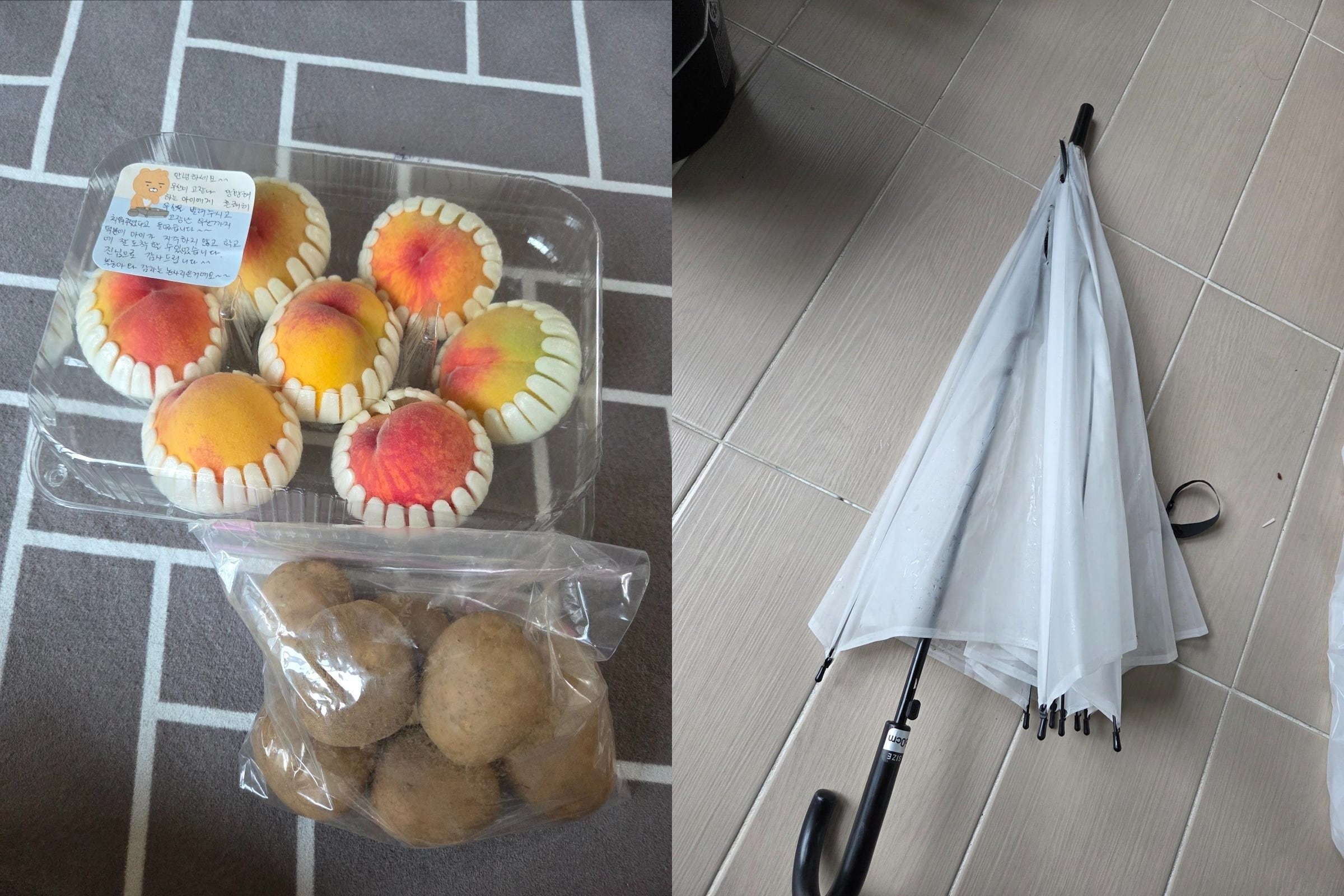 그날 저녁 출근할 때는 우산이 보이지 않았지만, 이틀 후 퇴근길에 자신의 우산이 문 앞에 돌아와 있는 것을 발견했다. 하지만 더 놀라운 일은 그다음 날 일어났다. 택배 때문에 현관문을 열었던 A씨는 감사의 마음을 담은 쪽지와 함께 직접 재배한 감자와 복숭아가 놓여있는 것을 발견했다. 여고생의 부모로 보이는 아파트 주민이 전한 것이었다.