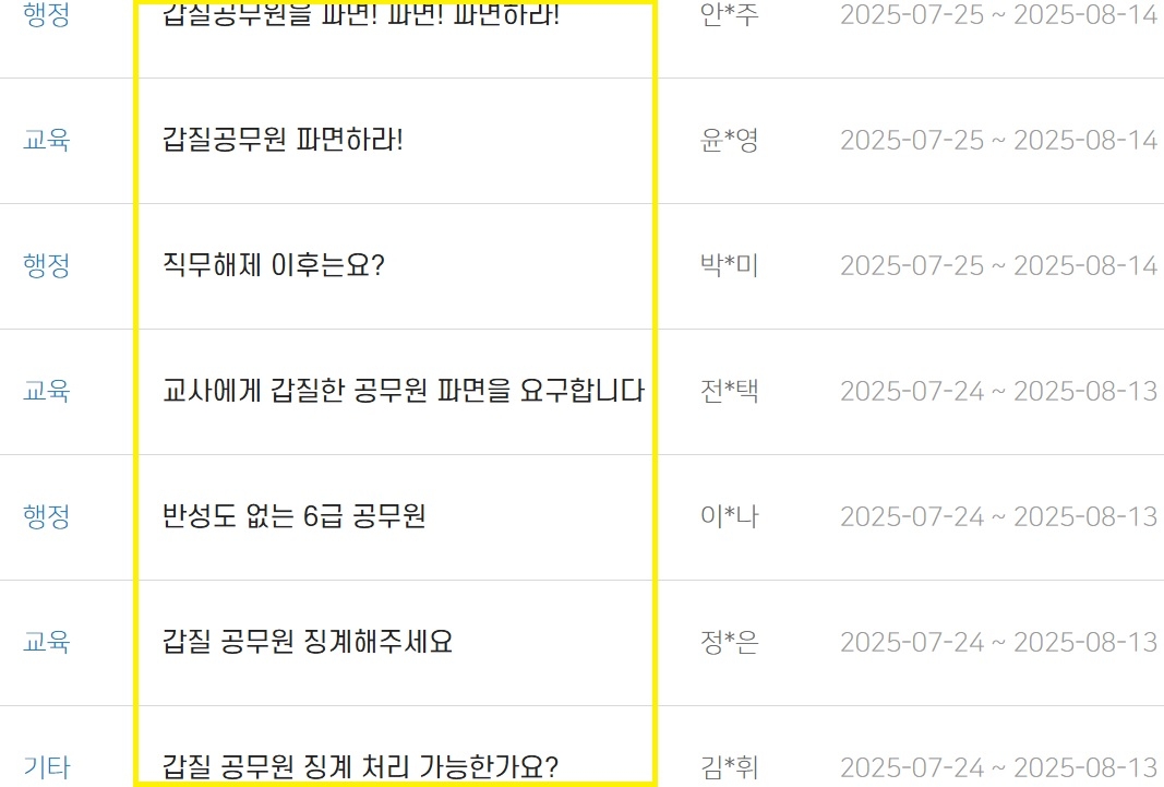 한 시민은 “청렴하고 본보기가 되어야 할 공무원이 갑질이라니요”라며 “(강선우 여성가족부)장관 후보자도 갑질의혹으로 장관 후보자에서 사퇴했습니다. 갑질은 공직자로서의 자격을 유지할 수 없는 일입니다. 당연히 파면 결정이 되어야 합니다”라고 주장했다.