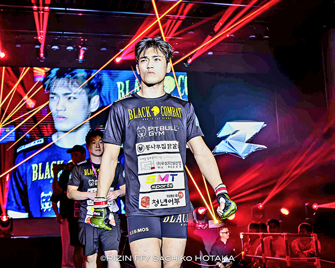 ‘붉은매’ 지혁민이 2025년 5월 블랙컴뱃 유니폼을 입은 채 인천광역시 파라다이스시티 라이진 월드시리즈 코리아 종합격투기 페더급 경기에 입장하고 있다. 사진=RIZIN FF |