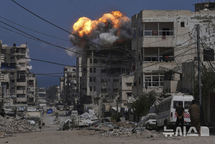 [가자시티=AP/뉴시스] 지난 21일(현지 시간) 가자지구 가자시티에서 이스라엘군의 공습을 받은 한 건물이 화염에 휩싸이고 있다. 2025.07.22. |