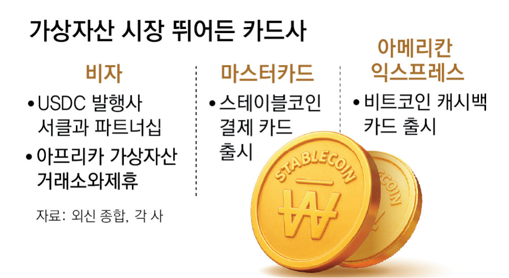 아메리칸 익스프레스는 지난달 나스닥 상장사 코인베이스와의 협업을 통해 ‘코인베이스 원 카드’를 내놓은 바 있다. 이 상품은 최대 4%의 캐시백을 비트코인으로 받을 수 있다. 마스터카드 역시 전 세계 2위 가상자산 거래소 OKX와 함께 ‘OKX 카드’ 출시를 준비 중이다. 홍성욱 NH투자증권 연구원은 “비자, 마스터카드 등 글로벌 카드사들이 앞다퉈 스테이블코인과 관련된 비즈니스 계획을 발표하고 있는 상황”이라며 “(지금처럼) 스테이블코인이 계속해서 일상에 깊숙이 침투할 경우 기존 금융사들의 사업 모델과 실적에도 영향을 미칠 수밖에 없을 것”이라고 진단했다.