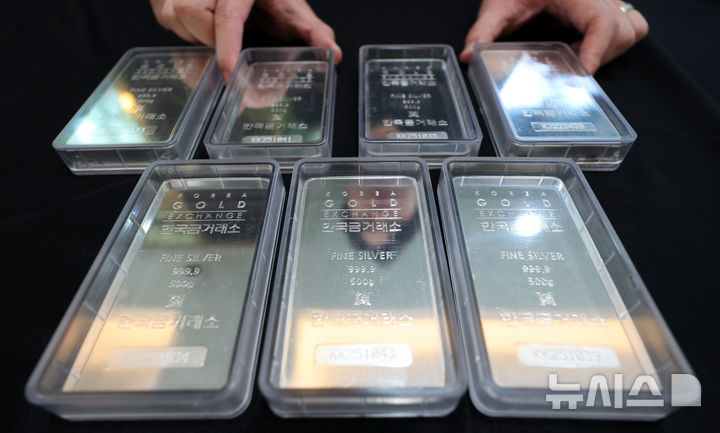 [서울=뉴시스] 김진아 기자 = 11일 서울 종로구 한국금거래소에 실버바가 진열돼있다.은 가격이 13년 만에 최고가를 기록했다. 미국 뉴욕상품거래소(COMEX)에 따르면 은 선물(7월 인도분) 가격은 10일 트로이온스당 37.02달러까지 올랐다. 1년 전보다 24.2% 상승한 수치다. 2025.06.11. bluesoda@newsis.com |