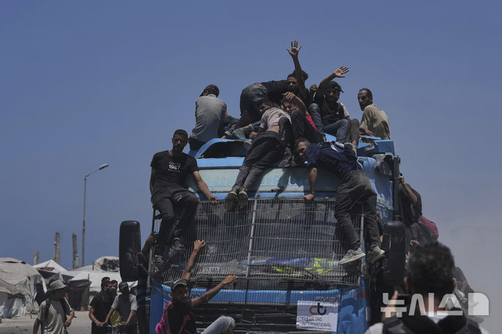 [가자시티=AP/뉴시스] 22일(현지 시간) 팔레스타인 주민들이 가자지구 북부에서 가자시티로 들어오는 식량 트럭에 몰려들고 있다. 2025.07.25. |