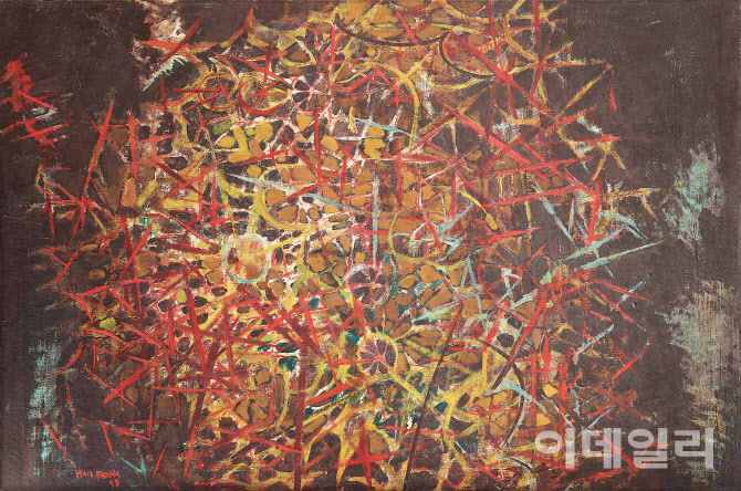 그중 ‘엉겅퀴’(1958)는 이 무렵 한묵의 탐색과 실험 중 하나다. 엉겅퀴는 본래 모습을 알아보기 힘들 만큼 분해됐고, 화면은 뾰족하고 날카로운 선들로 채워져 있다. 사물의 본질적 구조를 꿰뚫어보며 형태를 해체해내는 시도였다. 한묵은 ‘엉겅퀴’를 단순한 식물로 접근한 것이 아니라 인권 유린이나 언론 탄압 같은 사회 부조리에 대한 감정을 담아 표현한 것이라 회고하기도 했다. 엉겅퀴의 가시가 유독 날카롭게 느껴진다면 “그림은 곧 저항”이라 믿었던 그의 날 선 신념이 반영된 결과일 거다. 이렇게 조형적 실험과 에너지가 가득한 작품들은 이후 그가 맞이할 커다란 전환의 밑바탕이 됐다.