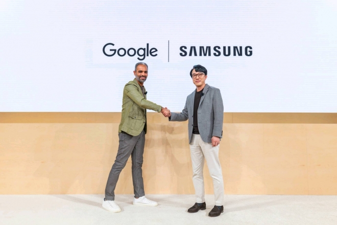 사미르 사맛(왼쪽) 구글 안드로이드 에코시스템 부문 사장과 최원준 삼성전자 MX사업부 개발실장 부사장이 지난해 12월 12일(현지시간) 미국 뉴욕 구글 캠퍼스에서 진행된 ‘XR 언락’ 행사에서 악수하고 있다. 삼성전자 제공 |