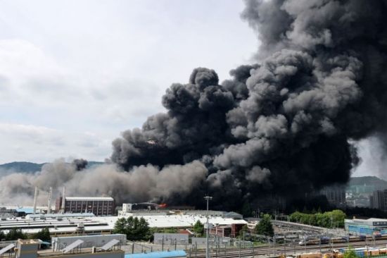 금호타이어 광주공장에서 발생한 대형 화재로 검은 연기가 하늘을 뒤덮고 있다. 광산구 제공 |