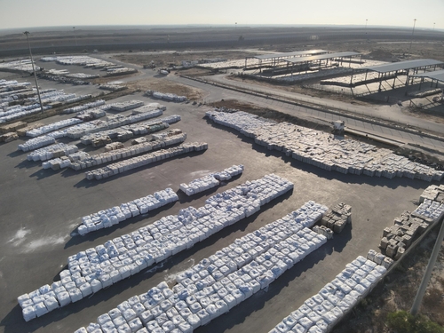 가자지구 앞 케렘샬롬 국경검문소에 쌓인 인도적 구호품 |