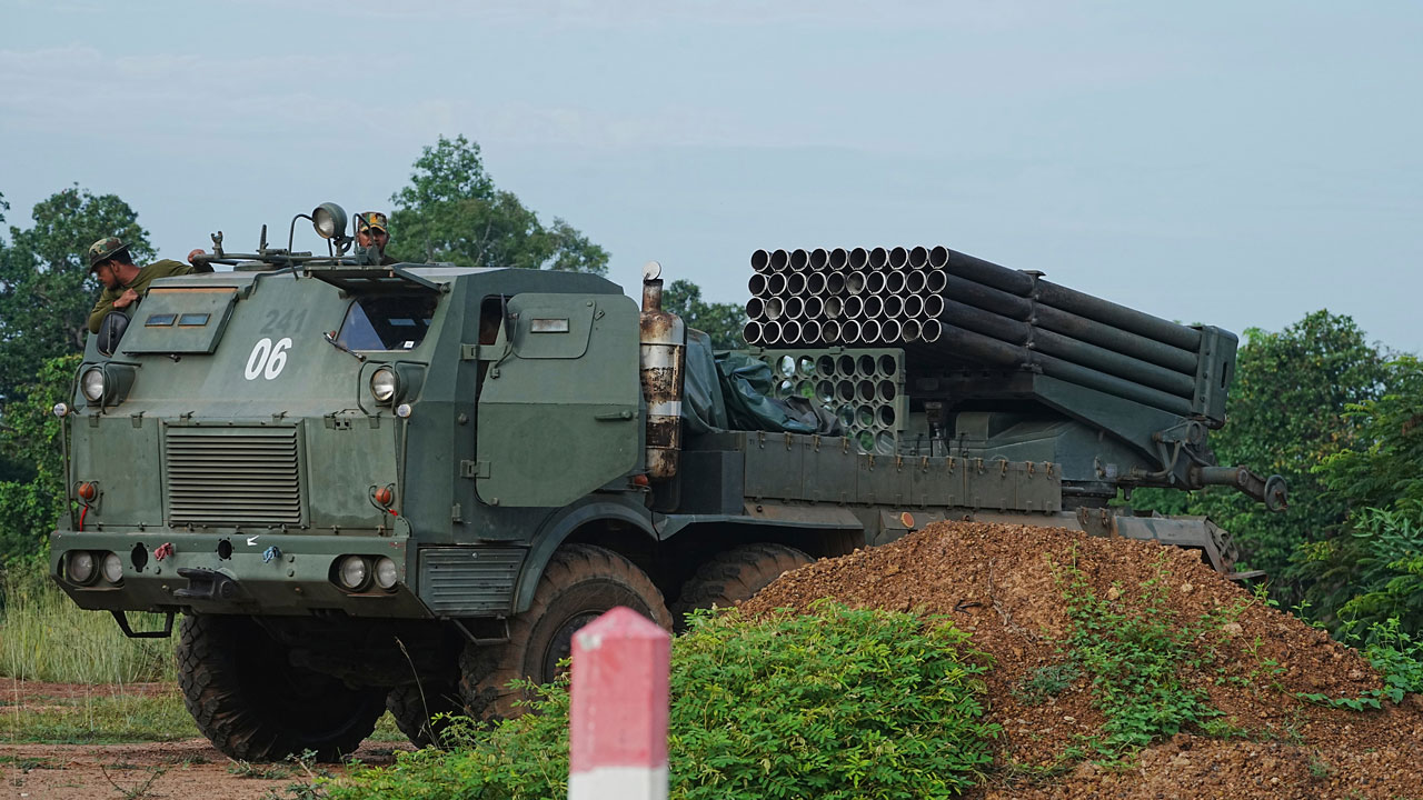 ▲ 캄보디아 오다르 미언체이 주에서 캄보디아 군용 차량이 로켓 발사기를 싣고 이동하고 있다.