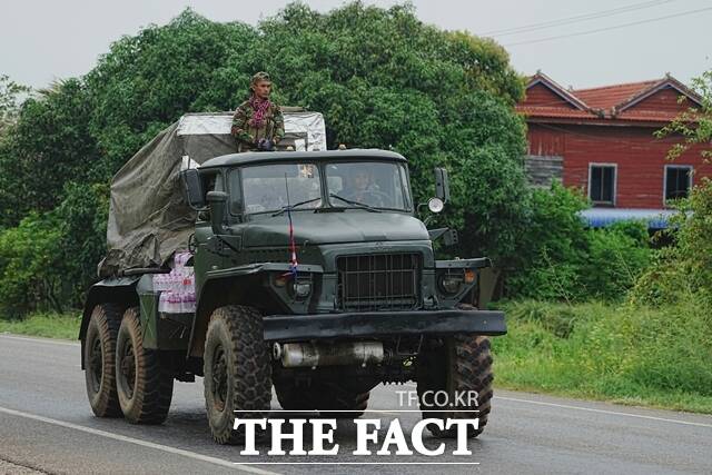 태국과 캄보디아 간 충돌이 장기화될 우려가 커지고 있다. 국경 충돌이 사흘째 이어지는 가운데 26일 국캄보디아 오다르민체이 주에서 캄보디아 군용 차량이 로켓 발사기를 싣고 이동하고 있다. /AP. 뉴시스 |