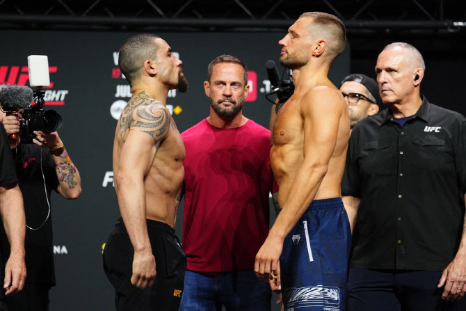 로버트 휘태커(왼쪽)과 레이니어 더 리더가 공식 계체를 마친 뒤 서로롤 바라보고 있다. 사진=UFC |