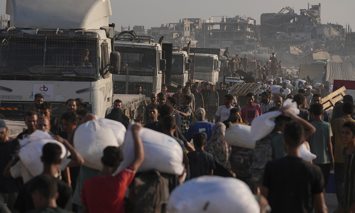 기다리던 구호물자… 가자 주민 굶주림 채워질까 팔레스타인 가자지구에서 굶주림·영양실조로 인한 사망자가 속출하는 가운데 26일(현지시간) 식량 등 구호물자를 싣고 가자지구에 들어온 인도주의 지원 트럭 주변을 밀가루 포대를 멘 주민들이 지나가고 있다. 가자지구=AP연합뉴스 |