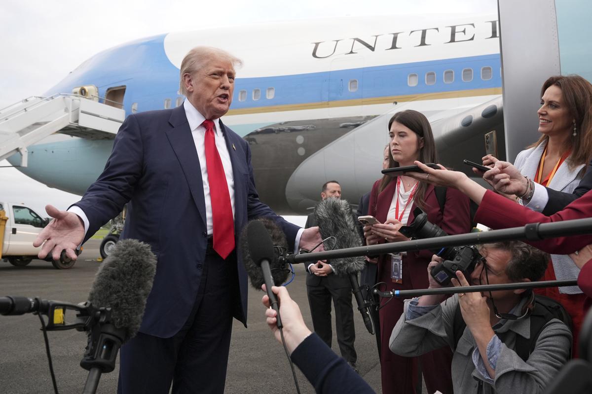 도널드 트럼프 미국 대통령이 25일(현지 시간) 스코틀랜드 에어셔의 프레스트윅 공항에 도착해 취재진에 발언하고 있다. 2025.07.26. 에어셔=AP/뉴시스 |