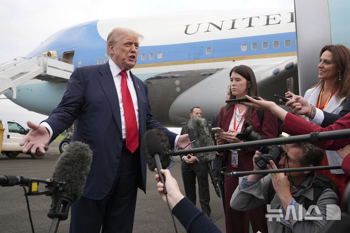 [에어셔=AP/뉴시스] 27일(현지 시간) CNN, 뉴욕타임스에 따르면 트럼프 대통령은 이날 EU(유럽연합)와의 무역협상 회담을 위해 방문한 스코틀랜드에서 기자들과 만나 "미국은 가자지구에 더 많은 지원을 하겠지만, 다른 국가들도 참여하길 바란다"고 말했다. 이 "이건 국제적 문제이지 미국만의 문제가 아니다"라며 이날 회담에서도 가자지구 지원 문제를 논의할 예정이라고 덧붙였다. 사진은 도널드 트럼프 미국 대통령이 25일(현지 시간) 스코틀랜드 에어셔의 프레스트윅 공항에 도착해 취재진에 발언하고 있다. 2025.07.28. |