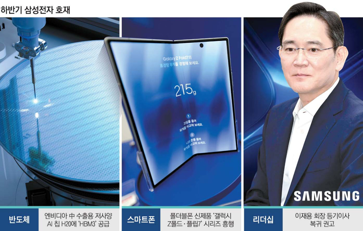 삼성전자가 하반기 실적 반등의 모멘텀에 불을 지피고 있다. 기업 간 고대역폭메모리(HBM) 경쟁이 심화에 따른 반사 이익뿐만 아니라, 폴더블폰 신제품 효과가 긍정적이다. 여기에 최근 사법 리스크에서 벗어난 이재용 회장이 본격적으로 경영 전면에 나설 가능성도 커지면서 강력한 드라이브가 예상된다.