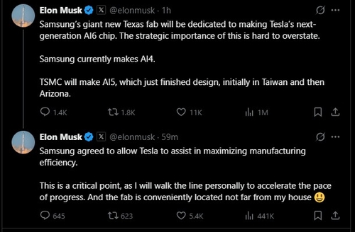 머스크 CEO는 이날 자신의 엑스(X·옛 트위터)에 올린 글에서 "삼성의 새로운 대규모 텍사스 공장이 테슬라의 차세대 AI6 칩 생산을 전담하게 될 것"이라며 "이것의 전략적 중요성은 과장하기 어렵다"고 밝혔다.