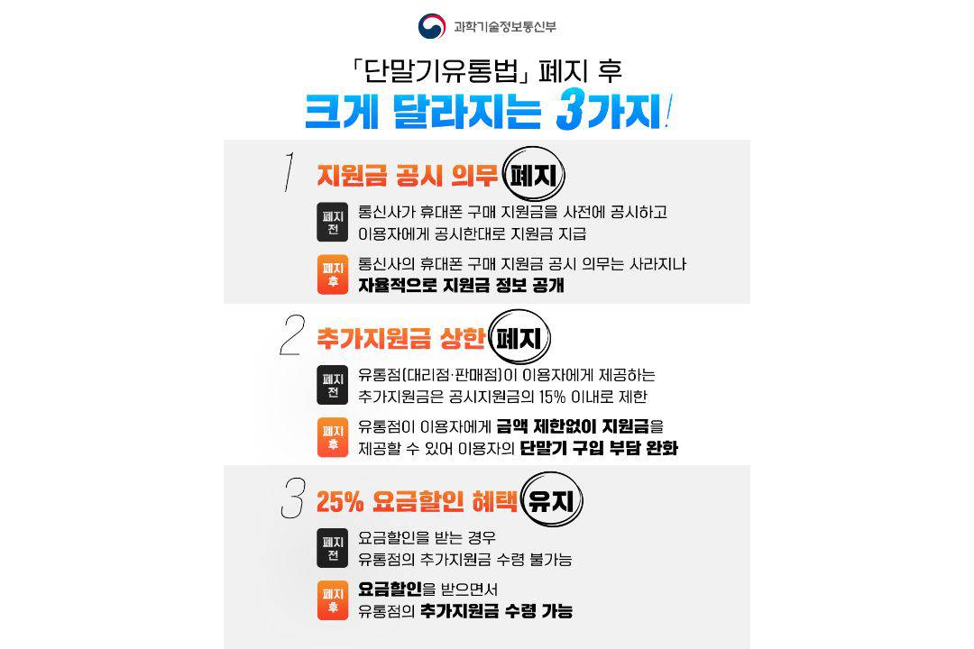 단통법은 당시 과열된 휴대폰 보조금 경쟁을 방지하고, 투명한 유통을 만들겠다는 취지로 도입됐지만, 소비자 간 불균형을 해소하기는커녕 시장 경쟁을 위축시켜 모든 소비자가 휴대폰을 비싸게 구매하는 결과를 낳았다. 또한 단통법 시행 중에도 ‘성지’와 같은 음성적인 불법 보조금이 공공연하게 지급되며 법은 유명무실해졌다. 결국 실효성 논란 끝에 단통법은 10년 만에 사라지게 됐다.2025년 7월 22일 단통법이 폐지됐다 / 출처=과기정통부 |