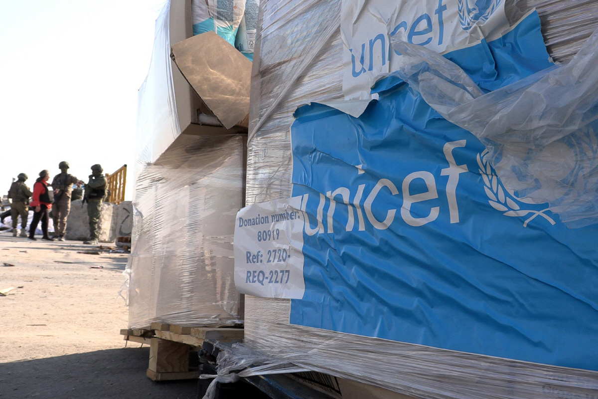 팔레스타인 가자지구 국경에 유니세프 구호물품이 준비돼 있다. 가자지구/AFP연합뉴스 |