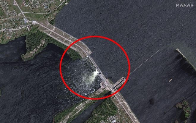 2023년 6월5일 우크라이나 남부 헤르손주 카호우카 댐이 파괴된 것으로 보인다. 맥사 테크놀러지 제공 |