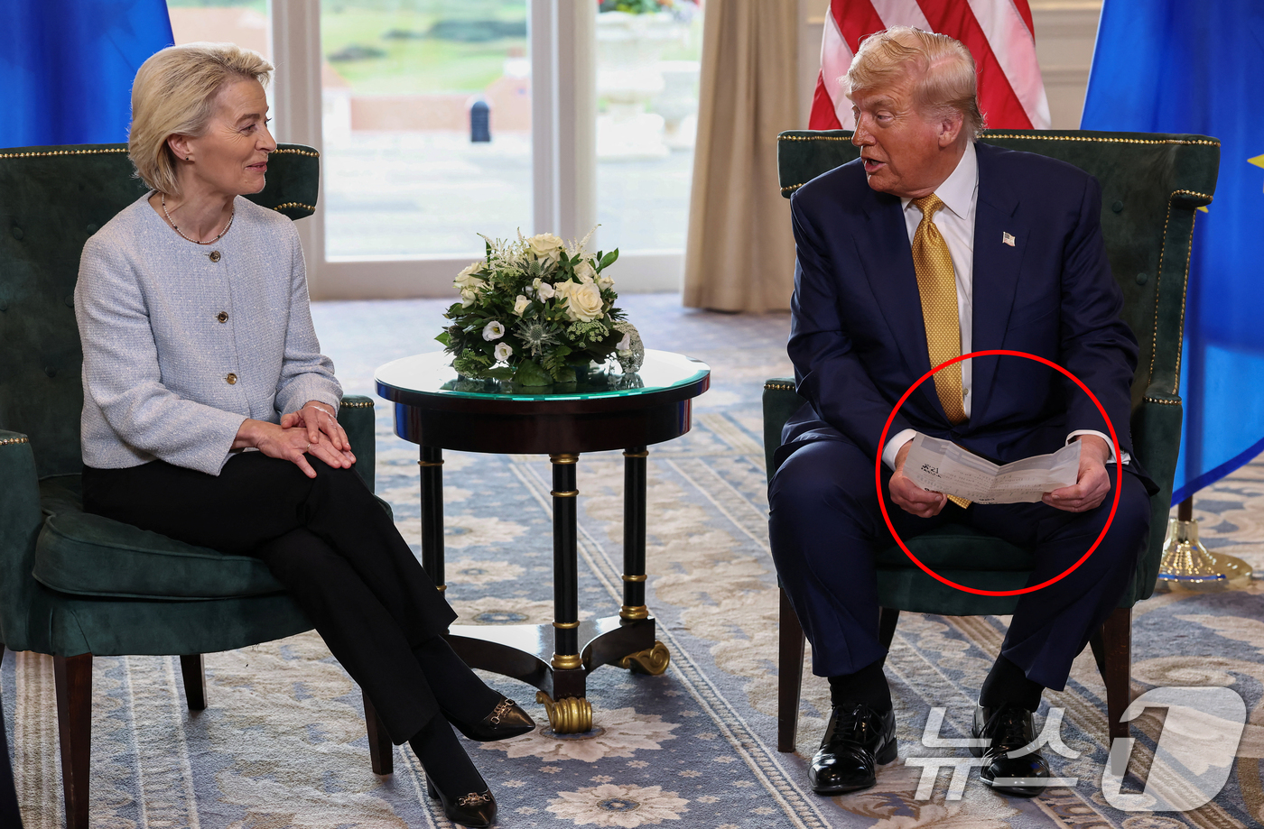 이날 스코틀랜드 턴베리의 회담장에서 트럼프 대통령이 들고 있던 'EU 측 제안'이라는 문서를 확대해 보면 그 흔적이 선명하게 남아 있다.
