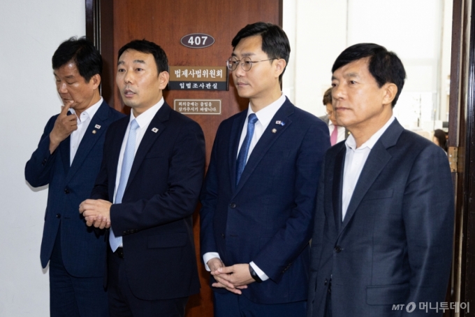 국회 법제사법위원회 더불어민주당 위원들이 28일 서울 여의도 국회에서 '집중투표제 의무' 등을 담은 상법 개정안을 법안심사제1소위원회에서 단독 처리한 후 취재진과 만나 질의응답을 하고 있다. 왼쪽부터 더불어민주당 박균택, 김용민, 장경태, 이성윤 의원. 2025.7.28/뉴스1 Copyright (C) 뉴스1. All rights reserved. 무단 전재 및 재배포, AI학습 이용 금지. |