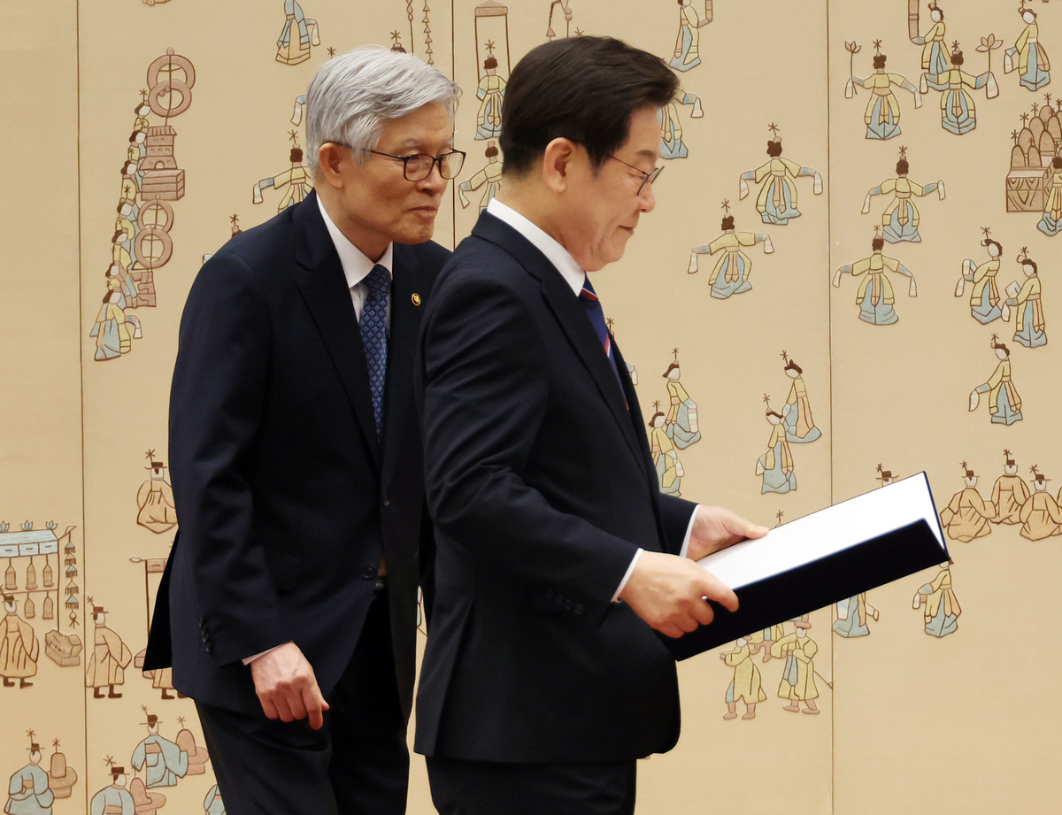 이재명 대통령이 28일 용산 대통령실에서 열린 신임 국무위원 및 국세청장 임명장 수여식에 참석해 있다. 왼쪽은 행사를 돕고 있는 최동석 인사혁신처장. 연합뉴스 |