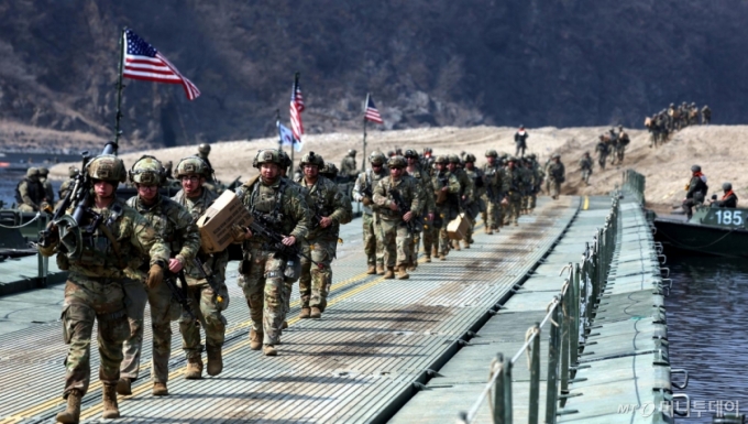 지난 3월20일 경기 연천군 임진강 일대 석은소 훈련장에서 열린 한미 연합 제병협동 도하훈련을 마친 장병들이 연합부교를 건너고 있다. 2025년 전반기 한미 연합연습의 일환으로 실시된 이번 훈련에는 국군 5·7공병여단과 미2사단, 한미연합사단 등 총 600여 명의 장병이 참가했다. / 사진=뉴시스 |