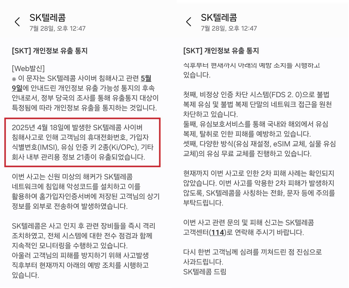 특히 “현재까지 이번 사고로 인한 2차 피해 사례는 확인되지 않았다”고 SKT는 부각했다. 그러면서 ‘2차 피해’가 발생하지 않도록 SKT를 사칭하는 전화·문자 등에 대한 이용자의 주의를 당부했다. 사이버 침해사고에 따른 개인정보 유출 가능성 통지 후 민관합동조사단의 최종 결과 안내 차원에서 이날 메시지를 발송했다는 게 SKT의 입장이다.
