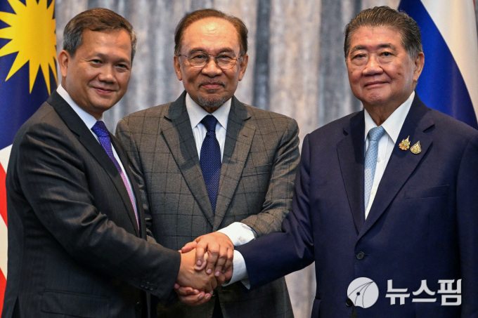 [푸트라자야 로이터=뉴스핌] 손지호 기자 = 캄보디아 총리 훈 마네트(왼쪽), 말레이시아 총리 안와르 이브라힘(가운데), 태국 총리 권한대행 품탐 웨차야차이가 28일(현지시간) 말레이시아 푸트라자야에서 태국-캄보디아 국경 분쟁 중재 회담이 열린 후 기자 회견을 마치고 사진을 찍으며 악수를 나누고 있다. 2025.07.28 thswlgh50@newspim.com |