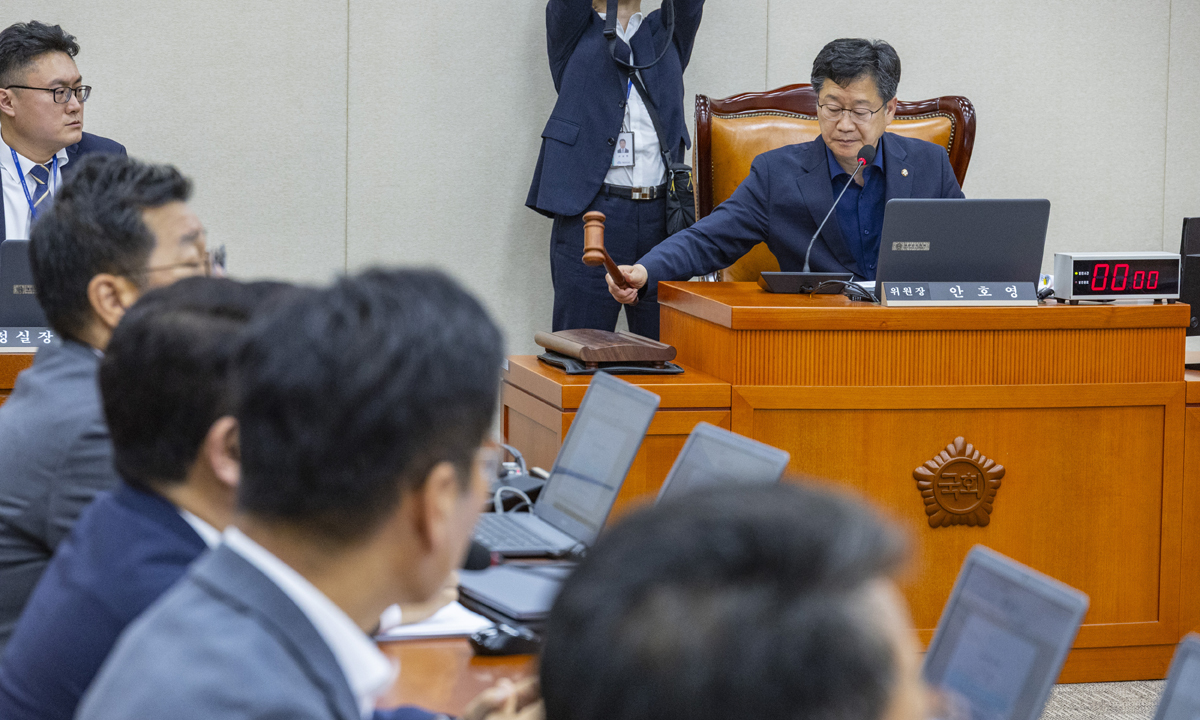 국회환경노동위원회 안호영 위원장이 28일 윤석열 전 대통령이 거부권(재의요구권)을 행사했던 '노란봉투법'(노조법 2·3조 개정안)을 처리하고 있다. 이날 노조법 2·3조 개정안은 이날 소위를 통과한 뒤 환노위 전체회의에서 국민의힘 의원들이 퇴장한 가운데 처리됐다. 연합뉴스 |