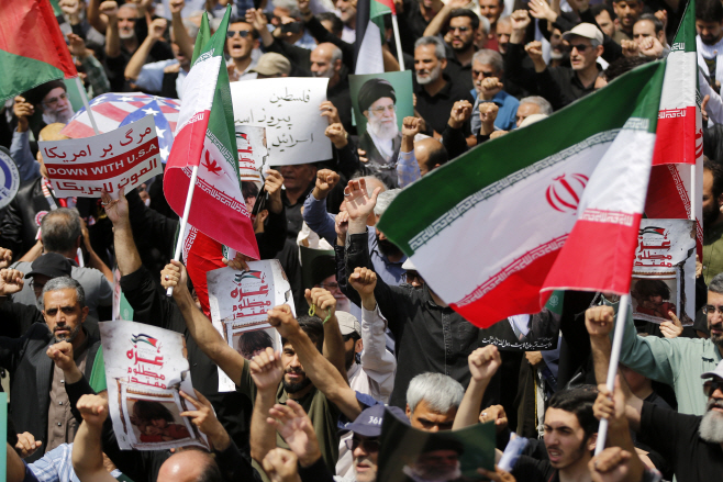 이란인들이 25일 이란 테헤란에서 팔레스타인인을 지지하고 이스라엘과 미국을 규탄하는 집회를 열고 행진하고 있다. /신화·연합 |