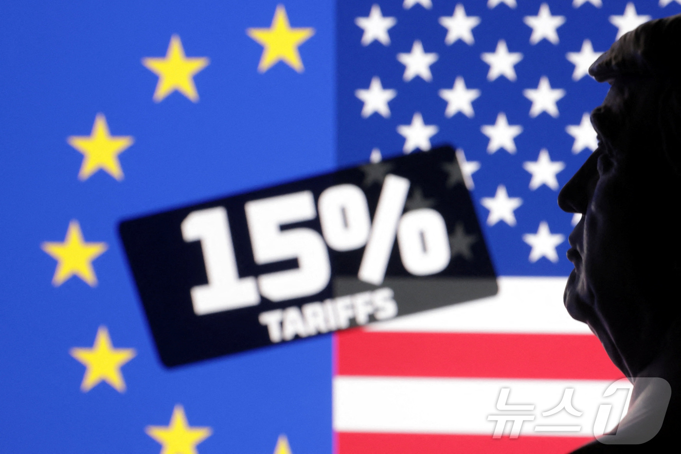 27일 유럽연합기와 성조기 앞에 도널드 트럼프 미국 대통령의 미니어처 조형물이 놓여 있다. 2025.7.27 ⓒ 로이터=뉴스1 ⓒ News1 강민경 기자 |
